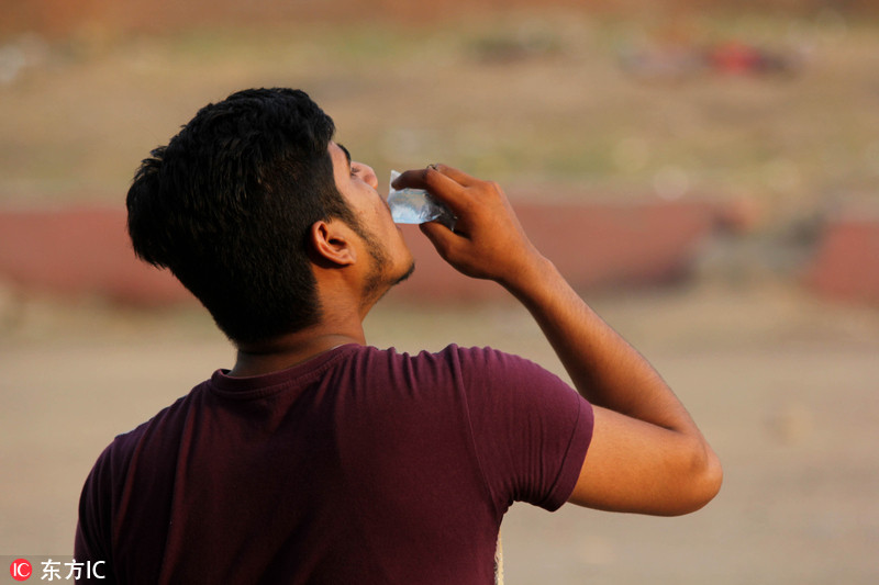 45度高温天横扫印度北部 女孩街头喝自来水降温