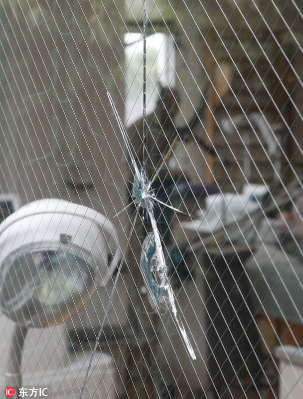 当地时间2018年5月24日,日本熊本县益城町,当地一间医院的玻璃被从天而降的金属片砸破。经日本国土交通省相关部门及日本航空公司调查,这些金属片是飞机引擎零件的一部分,因故障而脱落。