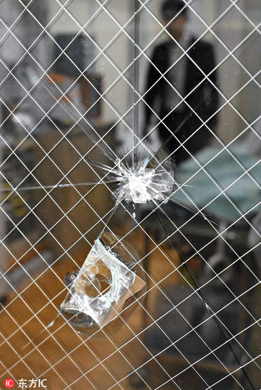 当地时间2018年5月24日,日本熊本县益城町,当地一间医院的玻璃被从天而降的金属片砸破。经日本国土交通省相关部门及日本航空公司调查,这些金属片是飞机引擎零件的一部分,因故障而脱落。