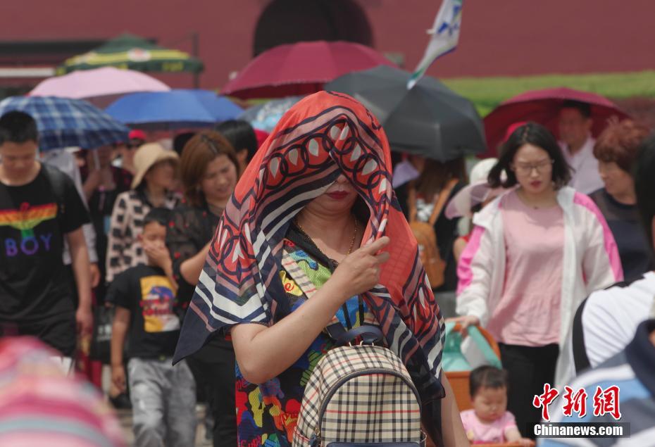 5月25日,北京炎热高温天气持续,天安门前一位游客把纱巾盖在头上防晒。 中新社记者 贾天勇 摄