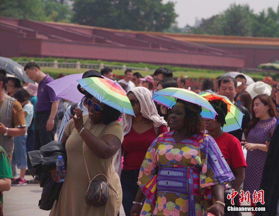 5月25日,北京炎热高温天气持续,外国游客戴伞帽在天安门前游览。 中新社记者 贾天勇 摄