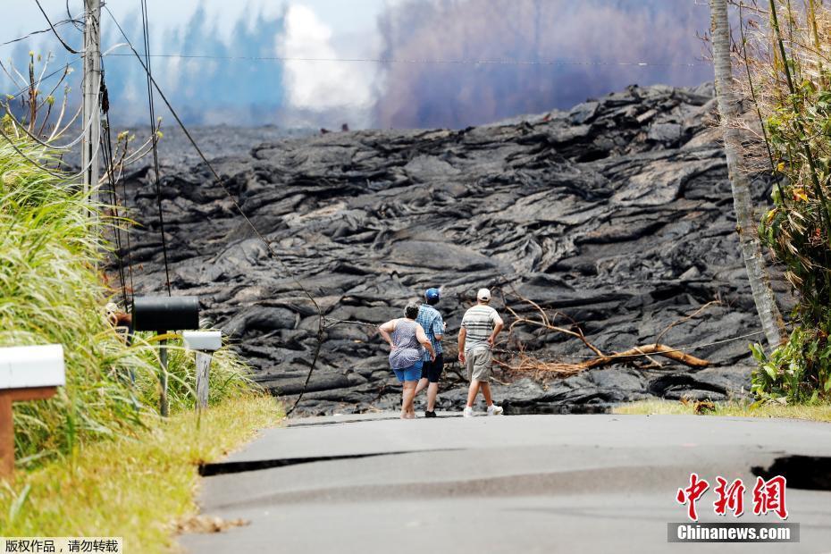 当地时间2018年5月24日,美国夏威夷,夏威夷基拉韦厄火山继续喷发,美国地质调查局工作人员与当地民众靠近火山附近拍摄熔岩喷发瞬间。基拉韦厄火山自本月3日开始爆发以来,已摧毁24栋房屋,逾两千居民紧急撤离。