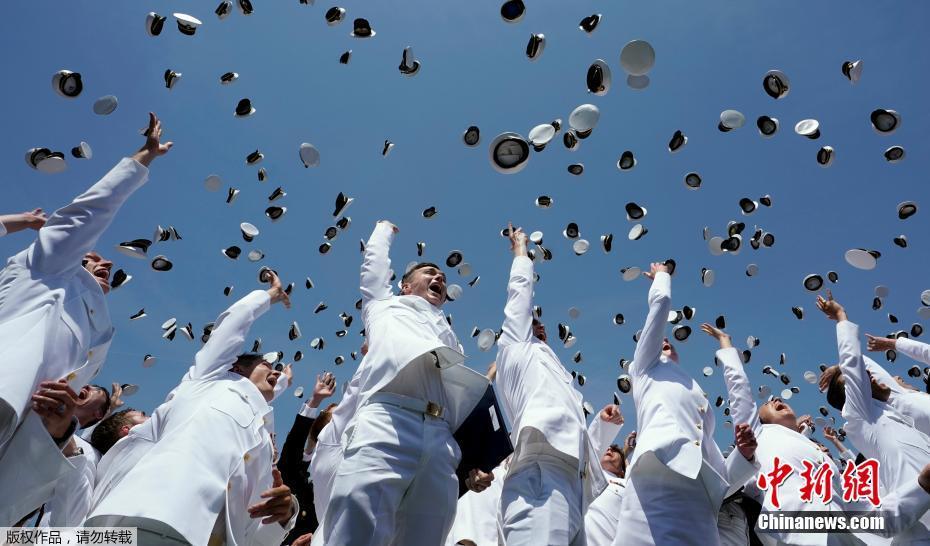 当地时间2018年5月25日,美国马里兰州安那波利斯市,美国海军学院举行盛大毕业典礼,学员扔帽子一片欢腾。
