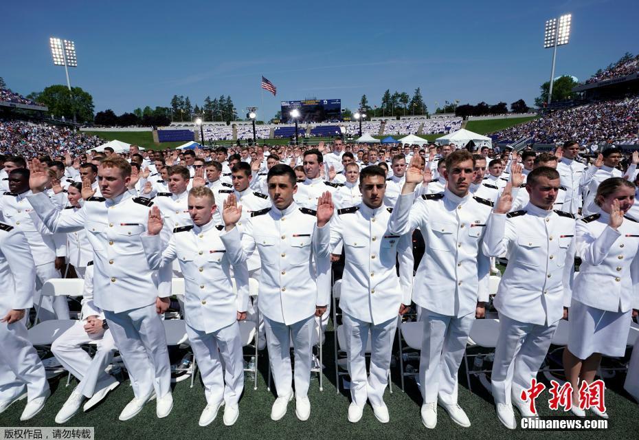 当地时间2018年5月25日,美国马里兰州安那波利斯市,美国海军学院举行盛大毕业典礼,学员扔帽子一片欢腾。