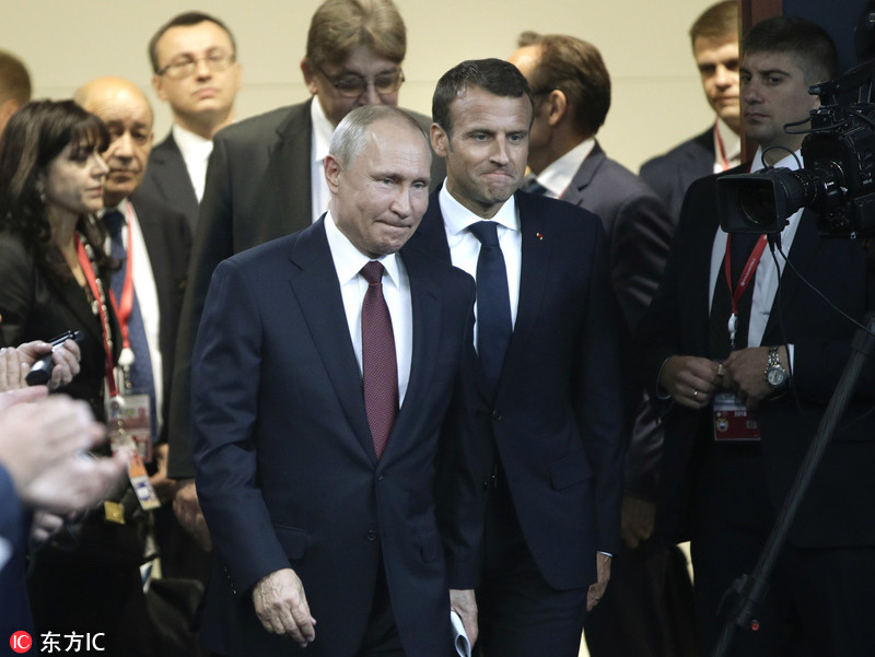 当地时间2018年5月25日,俄罗斯圣彼得堡,俄罗斯总统普京同法国总统马克龙出席圣彼得堡国际经济论坛。