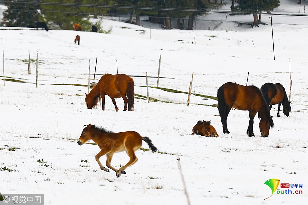2018年5月25日,新疆哈密天山草原,一匹小马驹在雪中奔跑。图片作者:普拉提/视觉中国