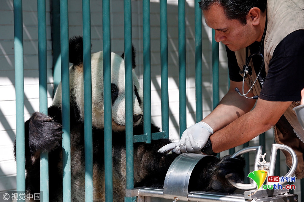 当地时间2018年5月25日,墨西哥墨西哥城,查普特佩克动物园中兽医从大熊猫“欣欣”身体抽血取样。