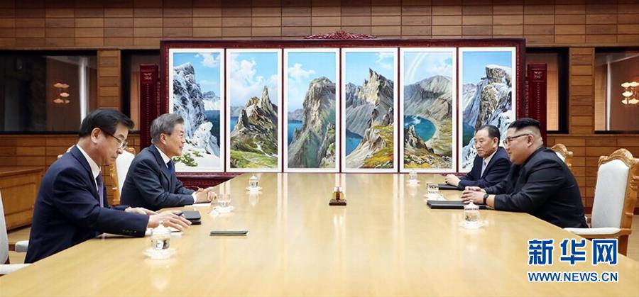 5月26日,韩国总统文在寅(左二)在板门店朝方一侧的统一阁与朝鲜国务委员会委员长金正恩(右一)举行会晤。 新华社发(青瓦台供图)