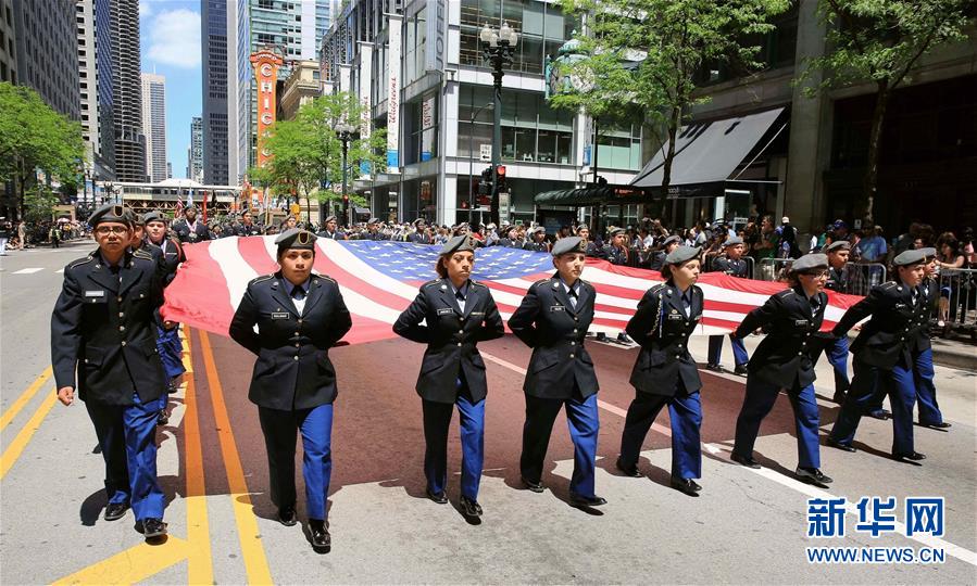 5月26日,在美国芝加哥,人们参加“阵亡将士纪念日”游行。 当日,美国芝加哥举行“阵亡将士纪念日”游行,缅怀在历次战争中牺牲的将士。新华社记者汪平摄