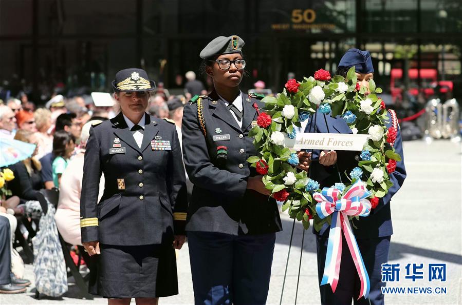 5月26日,在美国芝加哥,人们在“阵亡将士纪念日”游行前的纪念活动上献花圈。当日,美国芝加哥举行“阵亡将士纪念日”游行,缅怀在历次战争中牺牲的将士。 新华社记者汪平摄