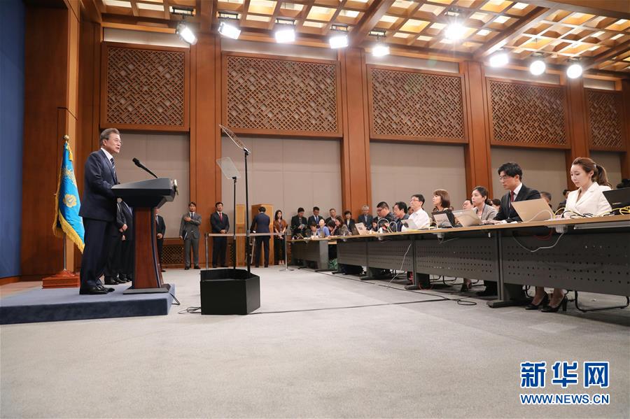 5月27日,韩国总统文在寅在首尔青瓦台宣布韩朝领导人会晤结果。韩国总统文在寅27日宣布韩朝领导人会晤结果,表示两国首脑认为应成功举行原定6月12日的朝美领导人会晤,同时再次明确应尽快履行《板门店宣言》。图片来源:新华网