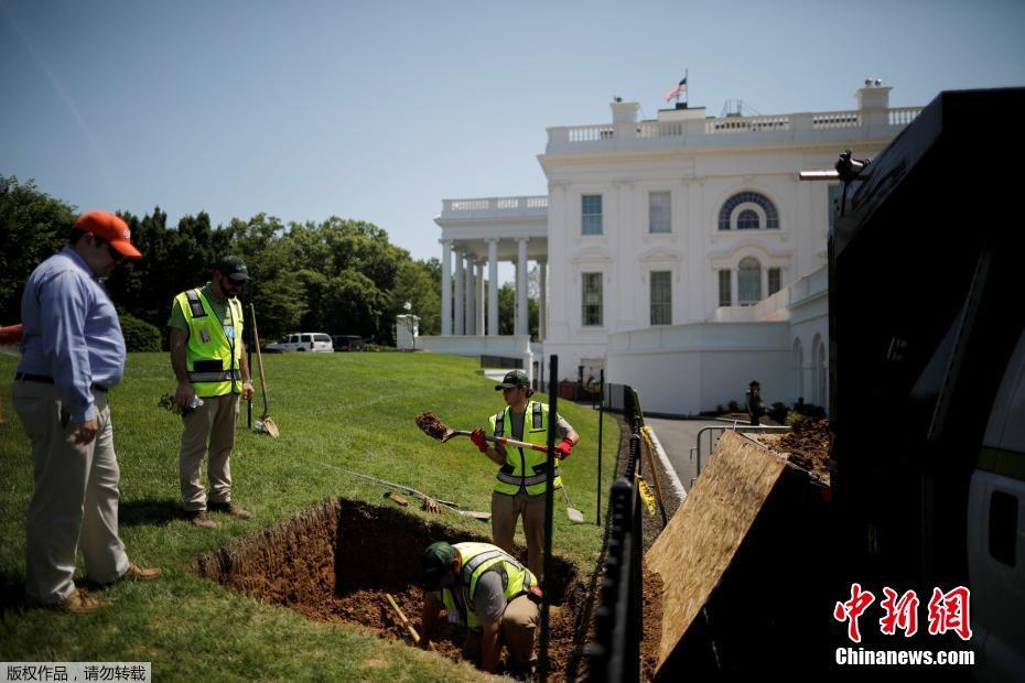 当地时间5月25日,美国华盛顿,工人修理白宫北草坪出现的一处天坑。