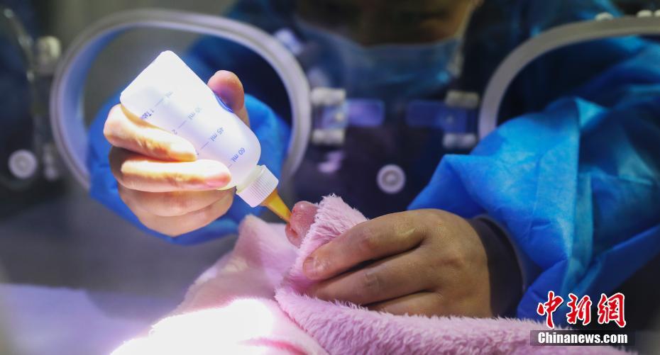 新生大熊猫“美萌”喝奶。 钟欣 摄