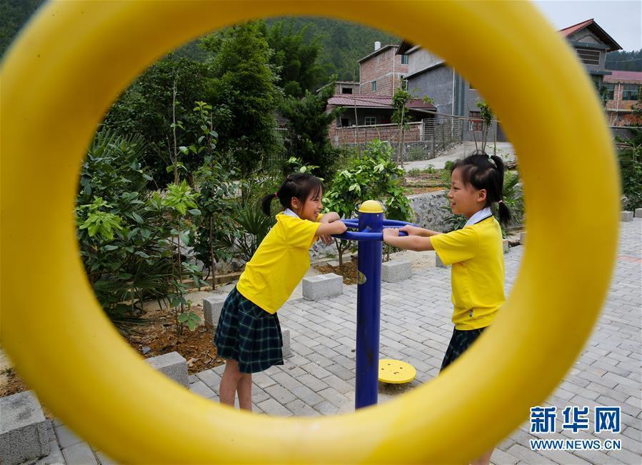 今年11岁的钟小芳(左)与双胞胎妹妹钟小兰在村里的健身器材旁玩耍。新华社记者 胡晨欢 摄 图片来源:新华网