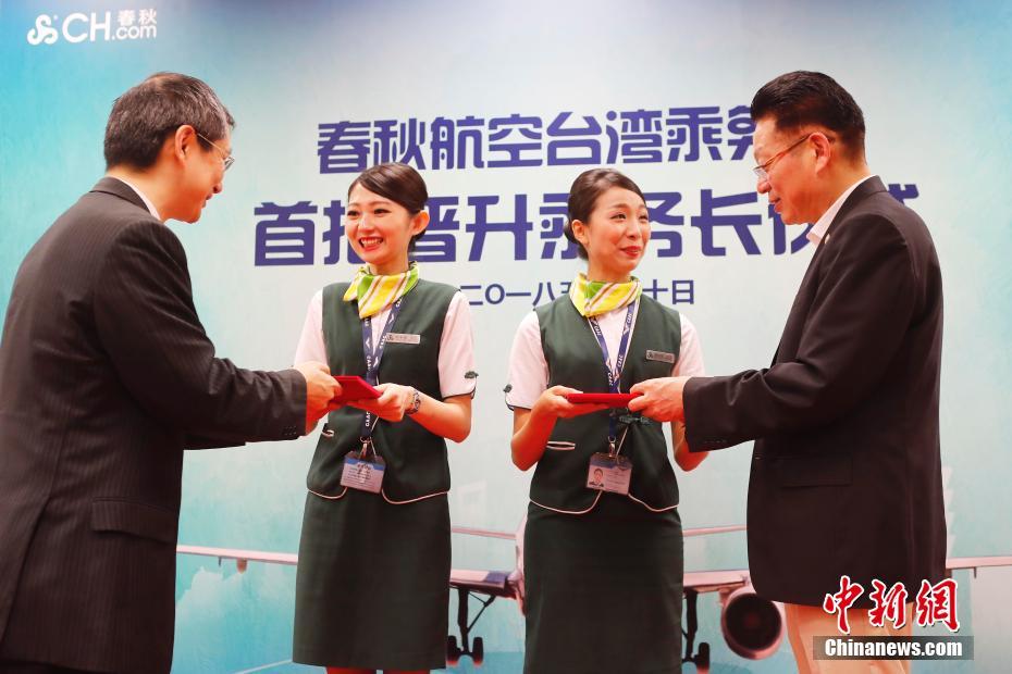 5月30日,春秋航空的两位台湾乘务员叶宇晴、黄佳莹经过晋级考核,正式晋升为乘务长。她们也成为了大陆首批台湾乘务长,当天分别率乘务组执飞上海至西安、石家庄航班。图为春秋航空为两位台湾乘务员举行了简单的晋升仪式。中新社记者 殷立勤 摄