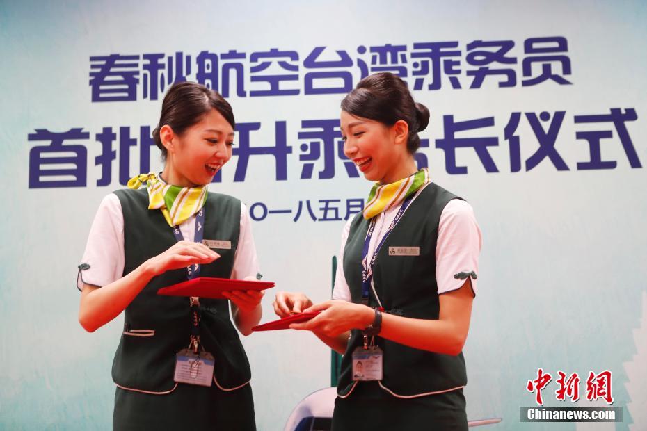 5月30日,春秋航空的两位台湾乘务员叶宇晴、黄佳莹经过晋级考核,正式晋升为乘务长。她们也成为了大陆首批台湾乘务长,当天分别率乘务组执飞上海至西安、石家庄航班。图为两位台湾乘务员叶宇晴、黄佳莹正式成为乘务长。中新社记者 殷立勤 摄