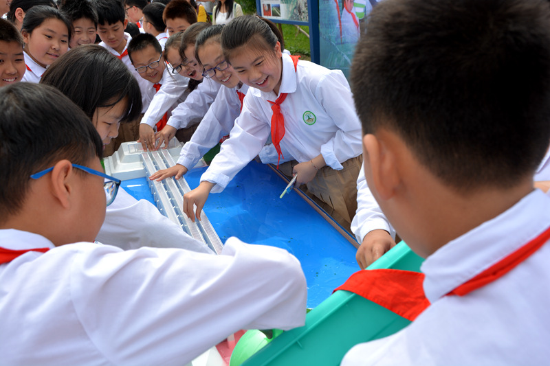 据了解,穿黄工程全国中小学生研学实践教育基地是教育批准的第一批研学基地。图为小学生们在通过模型了解水利工程的运行原理。(人民网记者孙博洋摄)