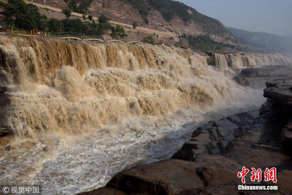 ​5月31日,山西临汾奔腾咆哮的黄河壶口瀑布吸引游客。近日,受上游地区降雨量增多影响,黄河干流晋陕峡谷水量大增,每秒流量达到1100立方,是常年同期的三倍,壶口瀑布出现五月份罕见的瀑布群景观,吸引了众多游客。 吕桂明 摄 图片来源:视觉中国