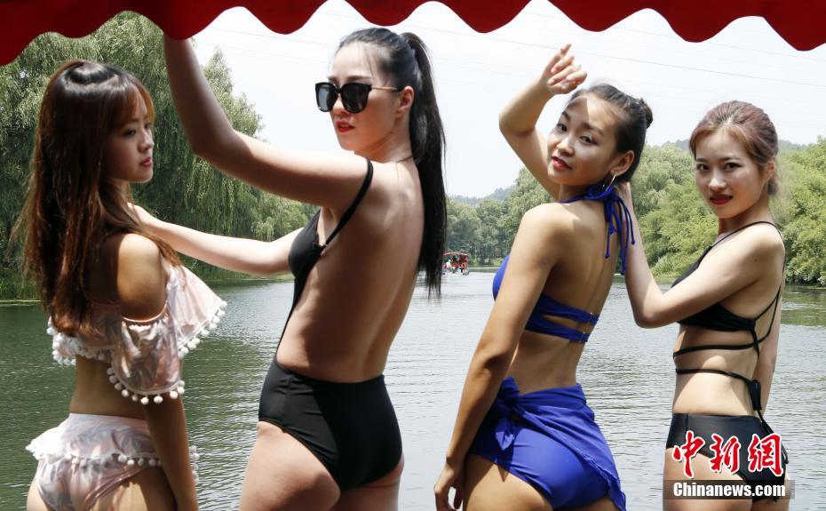 6月1日,2018国际旅游小姐大赛中国总决赛首站巡游在浙江安吉拉开帷幕,选自中国江苏、浙江、山东、福建、新疆、上海等地的53位佳丽参加大赛巡游活动。图为参赛佳丽在中南百草原身穿泳装展示风采。 中新社记者 钱兴强 摄