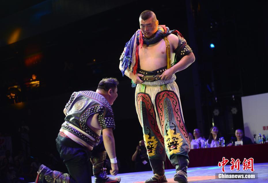 6月2日晚,日本选手星凤对阵戴有景嘎绸缎的中国搏克手孟和都楞,星凤倒地。当日,2018年度“草原情·哈萨尔搏克争霸赛”在位于内蒙古呼和浩特的乌兰恰特剧院开赛。赛制安排为“车轮战”:实力跤王孟和都楞连续挑战7名搏克手,来自日本的星凤也是7名之一。最终孟和都楞获得7连胜。中新社记者 刘文华 摄