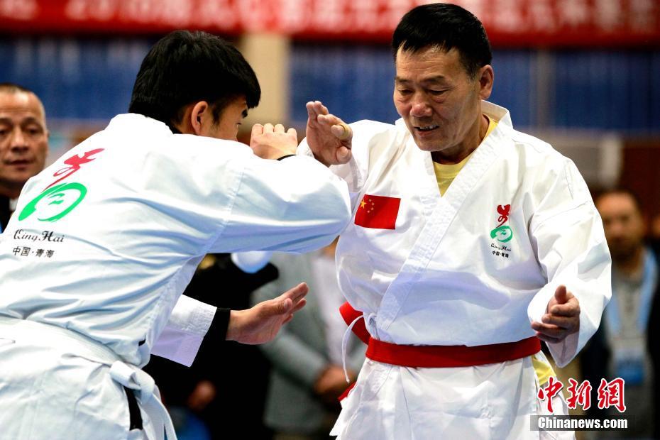 6月3日,青海省第十七届运动会武术套路(陈式心意混元太极拳)比赛在西宁开赛。图为选手参加桩上徒搏比赛。中新社记者 张添福 摄