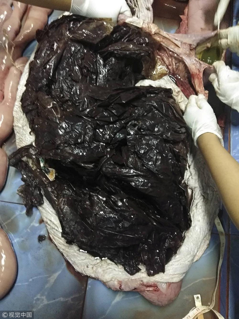 泰国海洋生物学家日前在宋卡府一潜湾救助了一头搁浅的短肢领航鲸,但这头鲸鱼最后还是不幸死去。经过解剖后发现,该鲸鱼的胃里藏有80多个塑胶袋,重达8公斤。