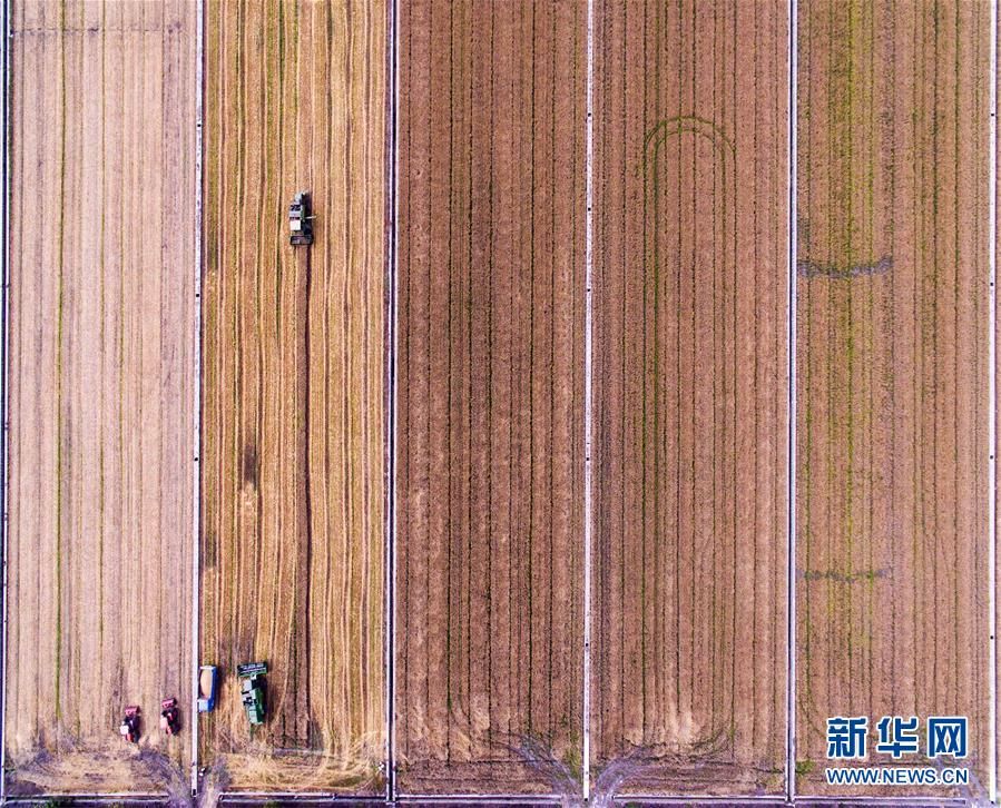 6月2日,收割机在江苏省泰州市红旗良种场田间收割小麦(无人机拍摄)。 新华社发(汤德宏 摄)