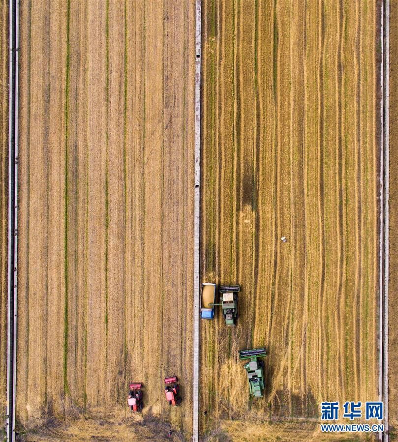6月2日,收割机在江苏省泰州市红旗良种场田间收割小麦(无人机拍摄)。 新华社发(汤德宏 摄)