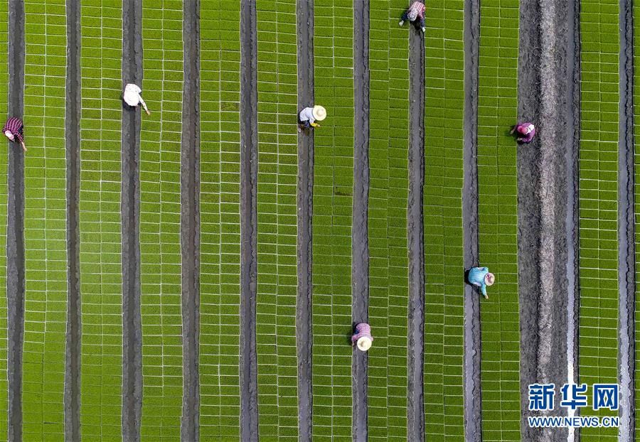 6月2日,江苏省泰州市红旗良种场员工在培育秧亩(无人机拍摄)。 新华社发(汤德宏 摄)
