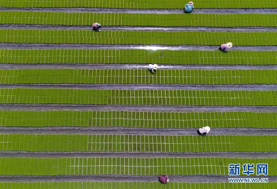 6月2日,江苏省泰州市红旗良种场员工在培育秧亩(无人机拍摄)。