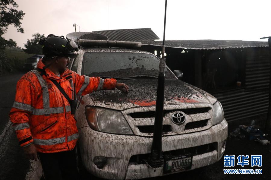 6月3日,在危地马拉奇马尔特南戈省的阿卡特南戈,一名救援人员站在落满火山灰的车辆旁。位于危地马拉首都危地马拉城西南约40公里的富埃戈火山3日猛烈喷发,已造成至少7人遇难。新华社发