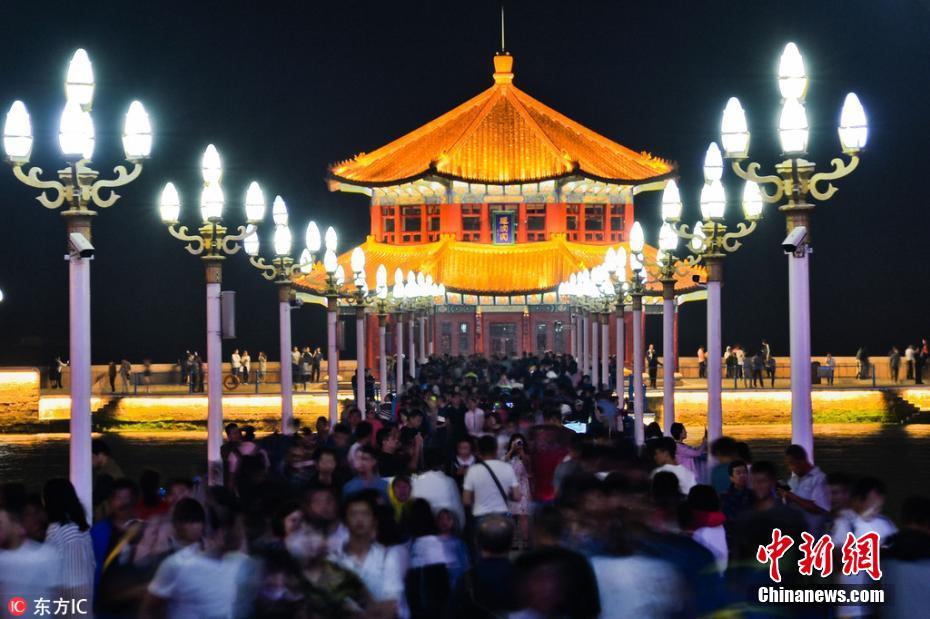 6月3日,随着上合组织青岛峰会临近,五彩缤纷的青岛夜景成为朋友圈新晋“网红”,吸引众多游客在夜晚徜徉海岸,观赏灯光旖旎的海上青岛。众多游客来到栈桥欣赏夜色青岛。王海滨 摄 图片来源:东方IC 版权作品 请勿转载