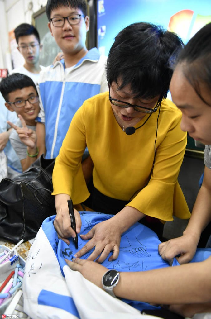 南昌市新建二中,高三的“最后一课”上,学生请老师在校服上留下签名。