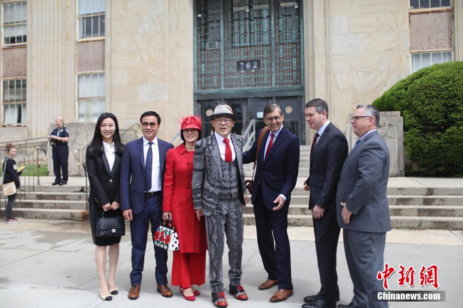 周立波夫妇在拿骚县法院外与律师等合影。中新社记者 廖攀 摄