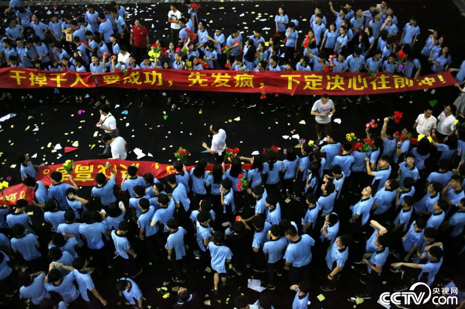 2018年6月4日晚19时40分许,距离2018年全国高考倒计时还有2天,海南省海口市山高中学(高中部)举行了一次别样的“喊楼”释压活动,近千名高中学子齐声高喊“高三加油”“高考必胜”等口号,以充满自信的姿态笑对即将到来的高考。 视觉中国