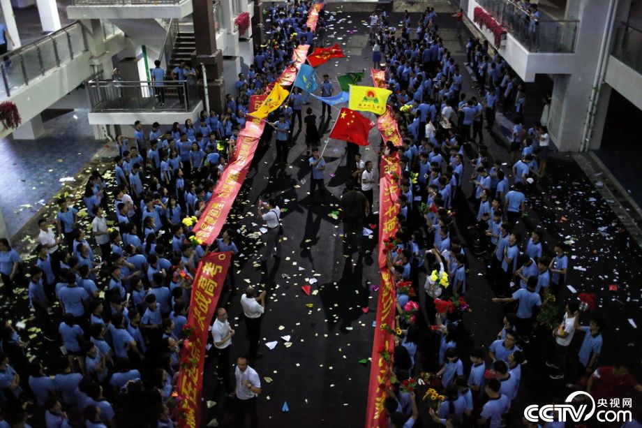 2018年6月4日晚19时40分许,距离2018年全国高考倒计时还有2天,海南省海口市山高中学(高中部)举行了一次别样的“喊楼”释压活动,近千名高中学子齐声高喊“高三加油”“高考必胜”等口号,以充满自信的姿态笑对即将到来的高考。 视觉中国