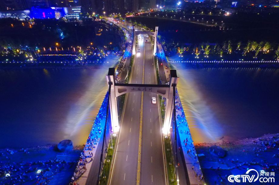 2018年6月4日,夜幕降临,南京市江宁区的小龙湾桥景观灯亮起,桥身两侧数十道喷泉齐刷刷开启,连绵起伏形成天然水幕。景观灯投射在水幕之上,变幻出紫、红、蓝、粉等多重色彩,炫目迷人。小龙湾桥是江宁区第一座悬索桥,全长约1064米,近日在网络走红以后,每天都有上千市民和游客前去“打卡”。 视觉中国