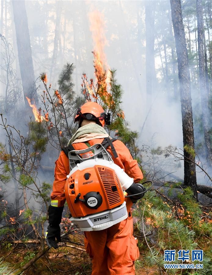 6月4日,一名武警森林部队战士在汗马国家级自然保护区扑火。 新华社记者 刘磊 摄