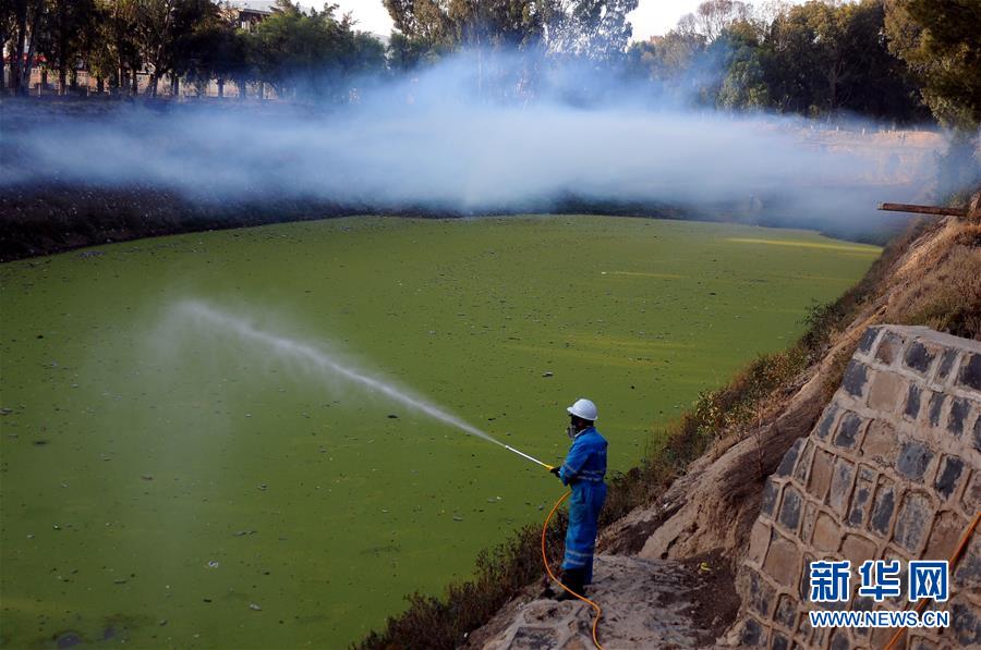6月4日,在也门萨那,公共卫生部门的员工喷洒消毒剂,预防新一轮霍乱疫情爆发。受战乱以及多国联军对也门实施海陆空封锁的影响,也门食品、药品及其他物资短缺十分严重,霍乱、白喉等疫情肆虐。 新华社发(穆罕默德摄)