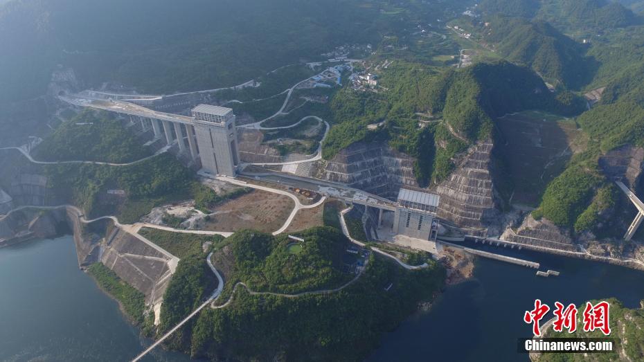 6月5日,贵州省乌江构皮滩水电站通航工程建设已接近尾声。第一级升船机主提升系统设备调试工作启动,第二级升船机主提升系统设备基本安装完成,第三级升船机主提升设备完成80%安装工作。构皮滩水电站通航工程设计标准为通航500吨级船舶,最高通航水头199m,是目前世界上通航水头和提升高度最高、主提升设备规模最大的通航工程。其通航设施建成后,可将黔中物资从贵州遵义县的乌江渡直达重庆市的涪陵入长江。图为航拍通航工程高127米的第二级和高79米的第三级升船机。中新社发 瞿宏伦 摄