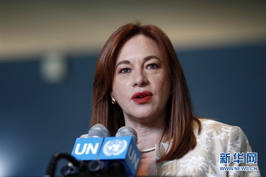 6月5日,在位于纽约的联合国总部,厄瓜多尔外长埃斯皮诺萨在当选第73届联合国大会主席后向记者发表讲话。第72届联合国大会5日选举厄瓜多尔外长埃斯皮诺萨为第73届联合国大会主席。埃斯皮诺萨将于今年9月新一届联大召开时接替现任联大主席莱恰克,她将是联合国历史上第4位女性联大主席。新华社记者李木子摄