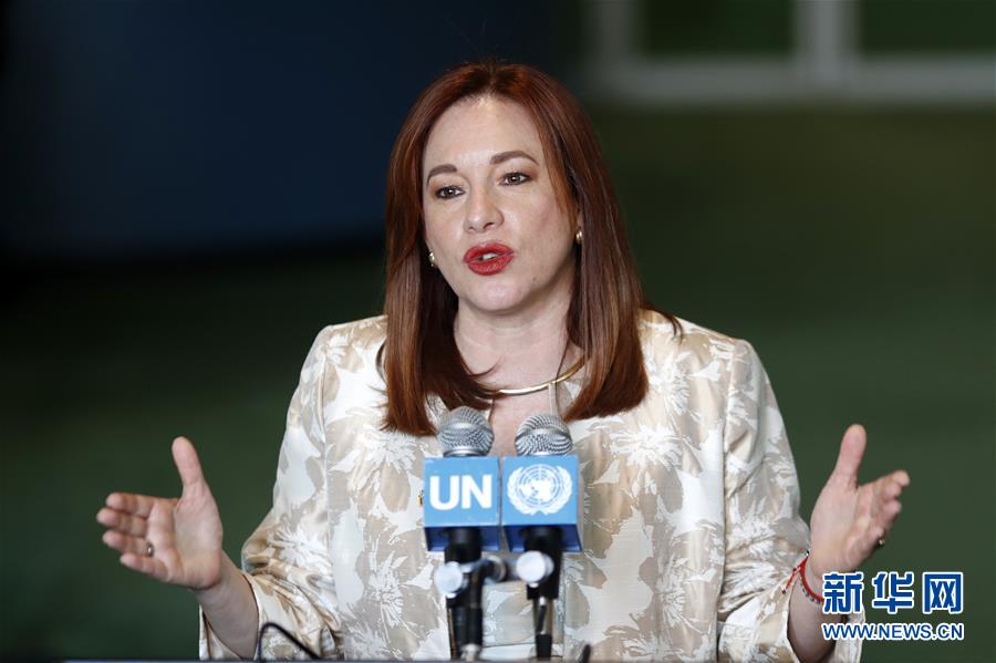 6月5日,在位于纽约的联合国总部,厄瓜多尔外长埃斯皮诺萨在当选第73届联合国大会主席后向记者发表讲话。第72届联合国大会5日选举厄瓜多尔外长埃斯皮诺萨为第73届联合国大会主席。埃斯皮诺萨将于今年9月新一届联大召开时接替现任联大主席莱恰克,她将是联合国历史上第4位女性联大主席。新华社记者李木子摄