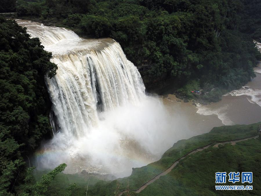6月5日,游客在黄果树瀑布景区游览。入汛以来,由于持续降雨,位于贵州省安顺市境内的黄果树瀑布进入丰水期,水流湍急,气势磅礴,吸引了众多游客。 新华社发(杨文斌 摄)
