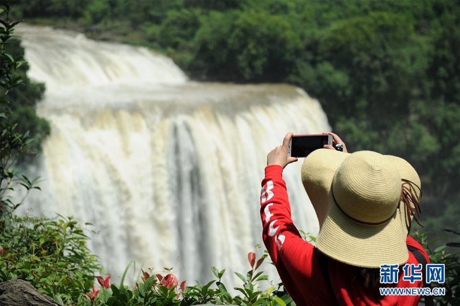 6月5日,游客在黄果树瀑布景区游览。入汛以来,由于持续降雨,位于贵州省安顺市境内的黄果树瀑布进入丰水期,水流湍急,气势磅礴,吸引了众多游客。 新华社发(杨文斌 摄)