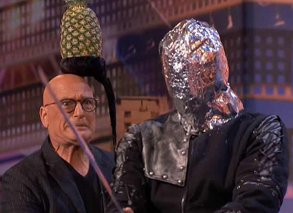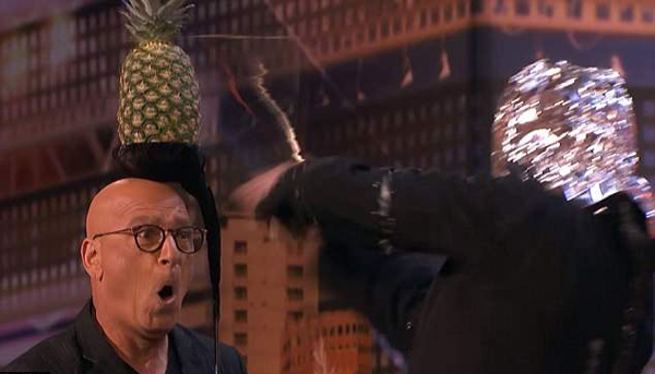 当他从背后拿出一把长刀时,观众席随即爆发出一阵喘息声和尖叫声。他挥舞起长刀,随着刀光从霍伊眼前闪过,他头顶的菠萝瞬间一分为二,观众席的尖叫声再次响起,霍伊也吓得跪到舞台上,一脸震惊,显然是被这种惊悚刺激的特技吓坏了。(环球网报道 记者 朱盈库)