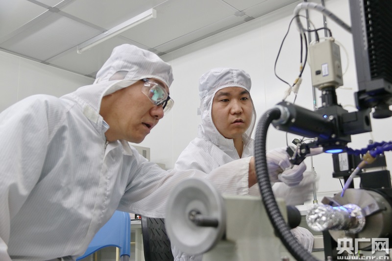 田进寿(左一)查看条纹变像管激光焊接工序 央广网 张美摄