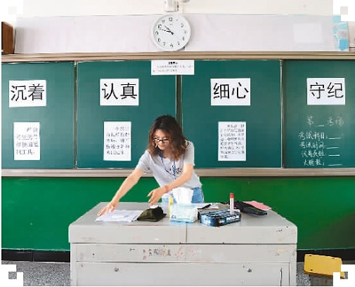 2018年高考已经拉开帷幕,图为在湖北省秭归县第一中学考点,监考教师在布置考场。