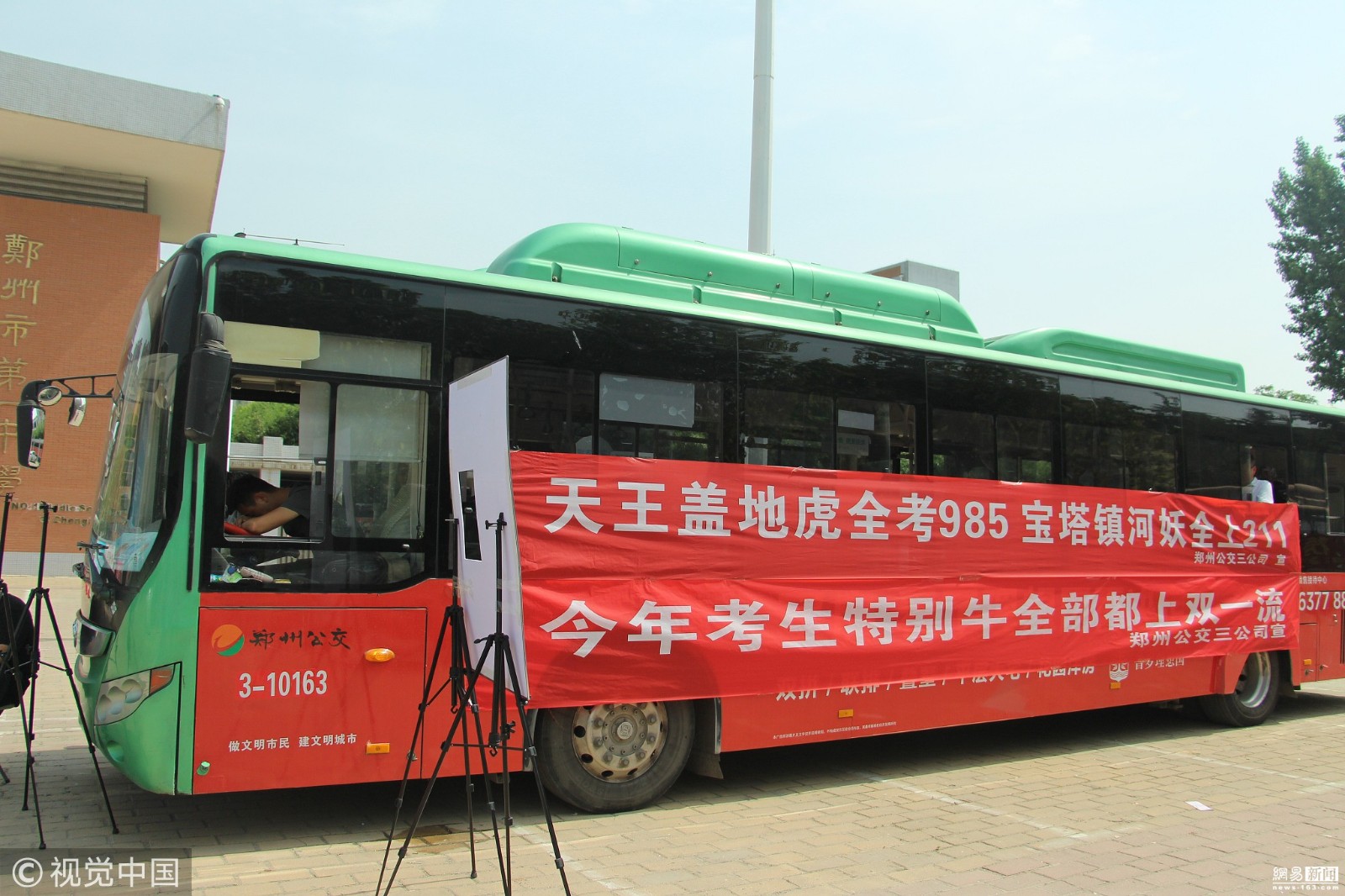 2018年6月7日,河南郑州的公交部门在多个考点门外设置了211路、985路公交车作为爱心驿站,为家长提供休息场地,还挂出了“天王盖地虎全考985 宝塔镇河妖全上211”等霸气十足的横幅,可谓直击家长心愿。(来源:视觉中国)