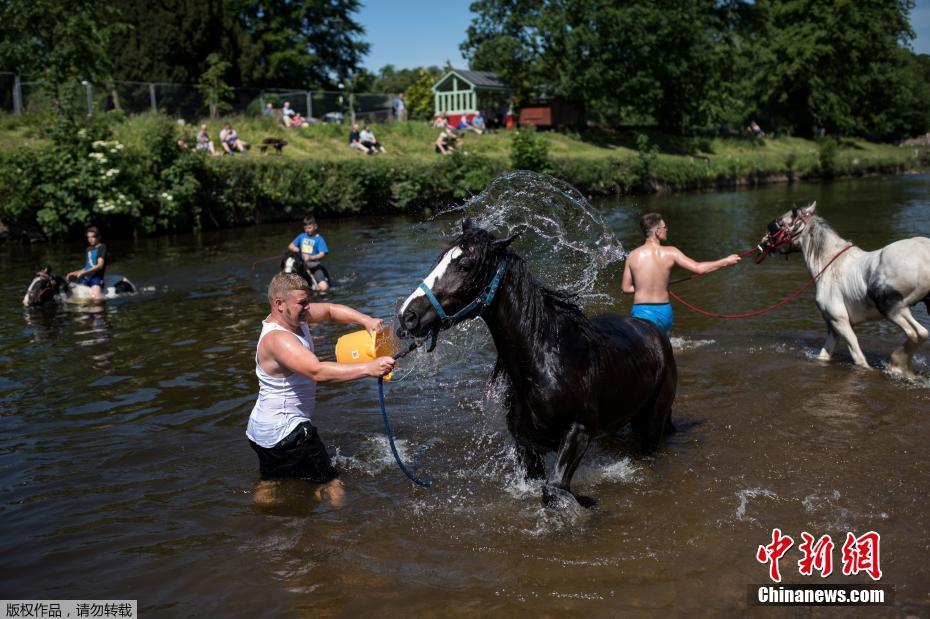 当地时间2018年6月7日,英国坎布里亚郡阿普比,年度阿普比马展拉开帷幕,数万名游客在此秀爱马、戏水、享受日光浴。阿普比马展是欧洲最大的传统吉普赛人活动,每年都会吸引约1万名吉普赛人和3万名游客前来参加。