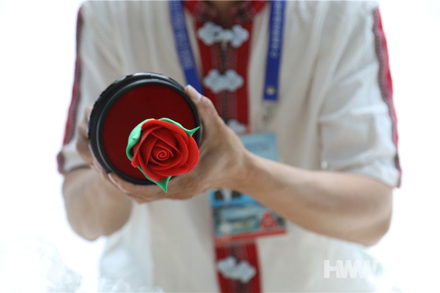 曹州面塑传承人穆绪建现场用面捏成了玫瑰花。